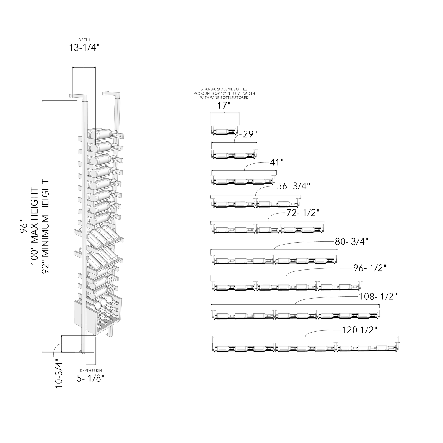 - 2 Bottle Deep = 13 1/4" (due to depth of u-shelf)