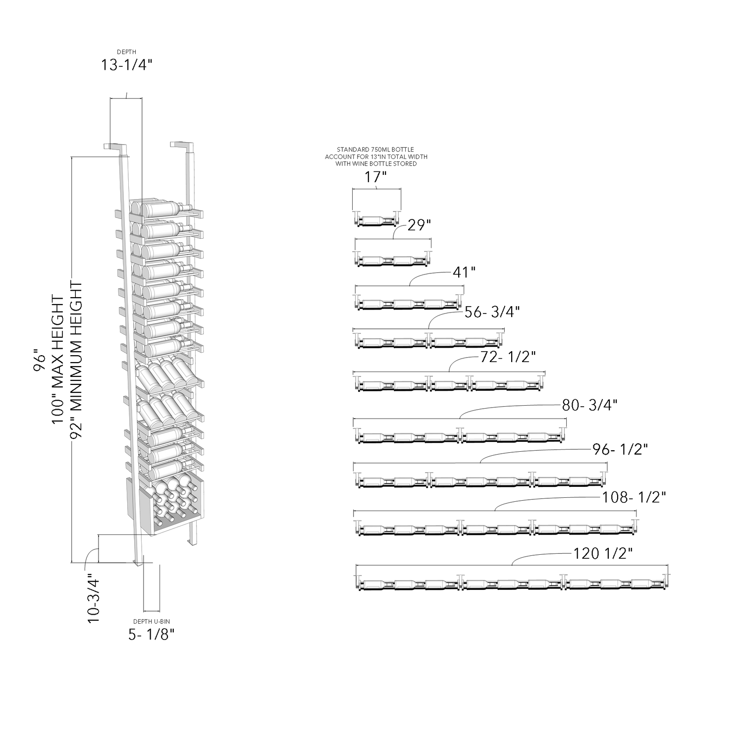 All Millesime wine racks come standard with wall tie-back brackets for mounting at the top of the rack and floor brackets for mounting at the bottom. Height is slightly flexible in that brackets can be extended to add an extra 4” or you may cut down the vertical posts by 4” for ceilings a little shorter than 8 feet.