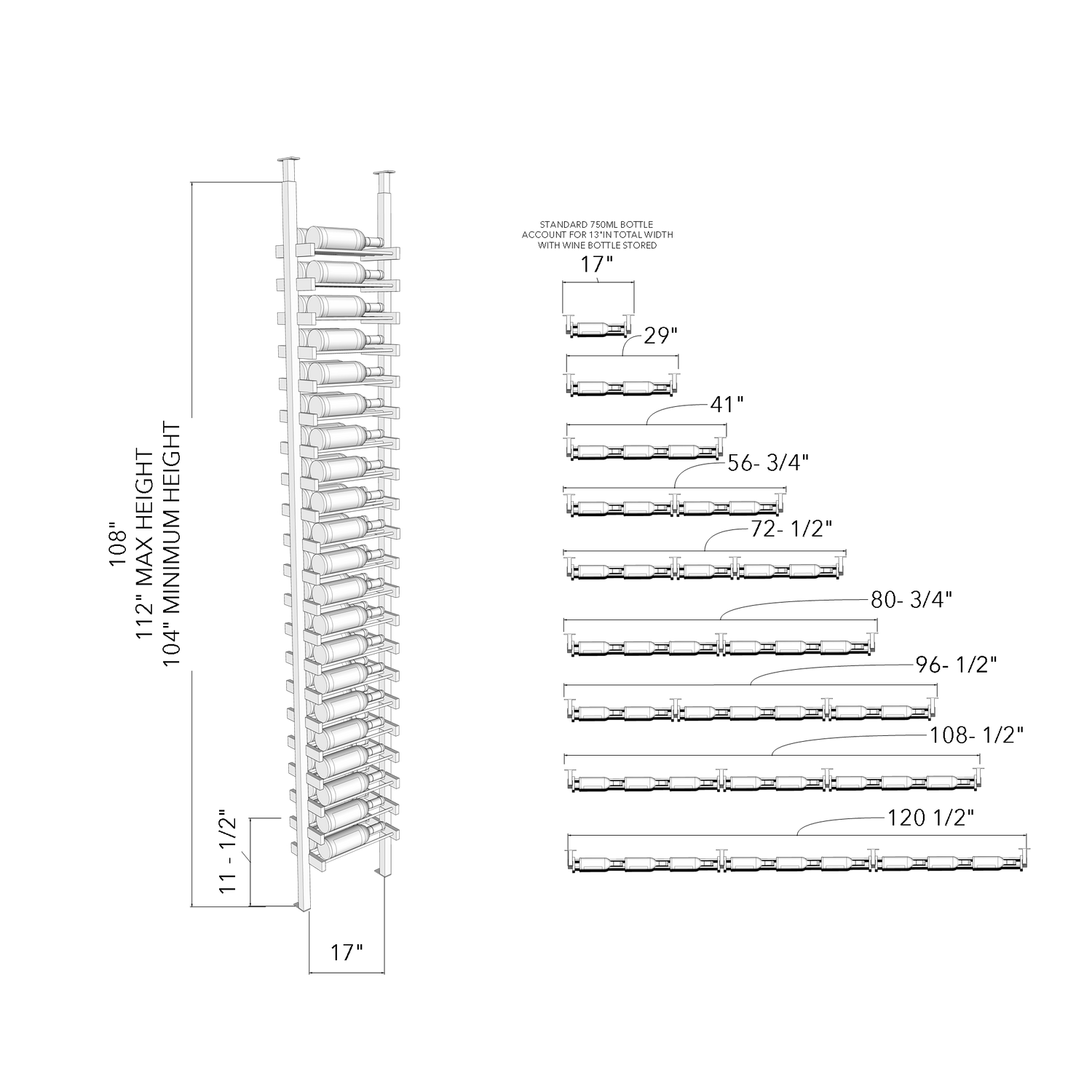 All Millesime wine racks come standard with wall tie-back brackets for mounting at the top of the rack and floor brackets for mounting at the bottom. Height is slightly flexible in that brackets can be extended to add an extra 4” or you may cut down the vertical posts by 4” for ceilings a little shorter than 8 feet.