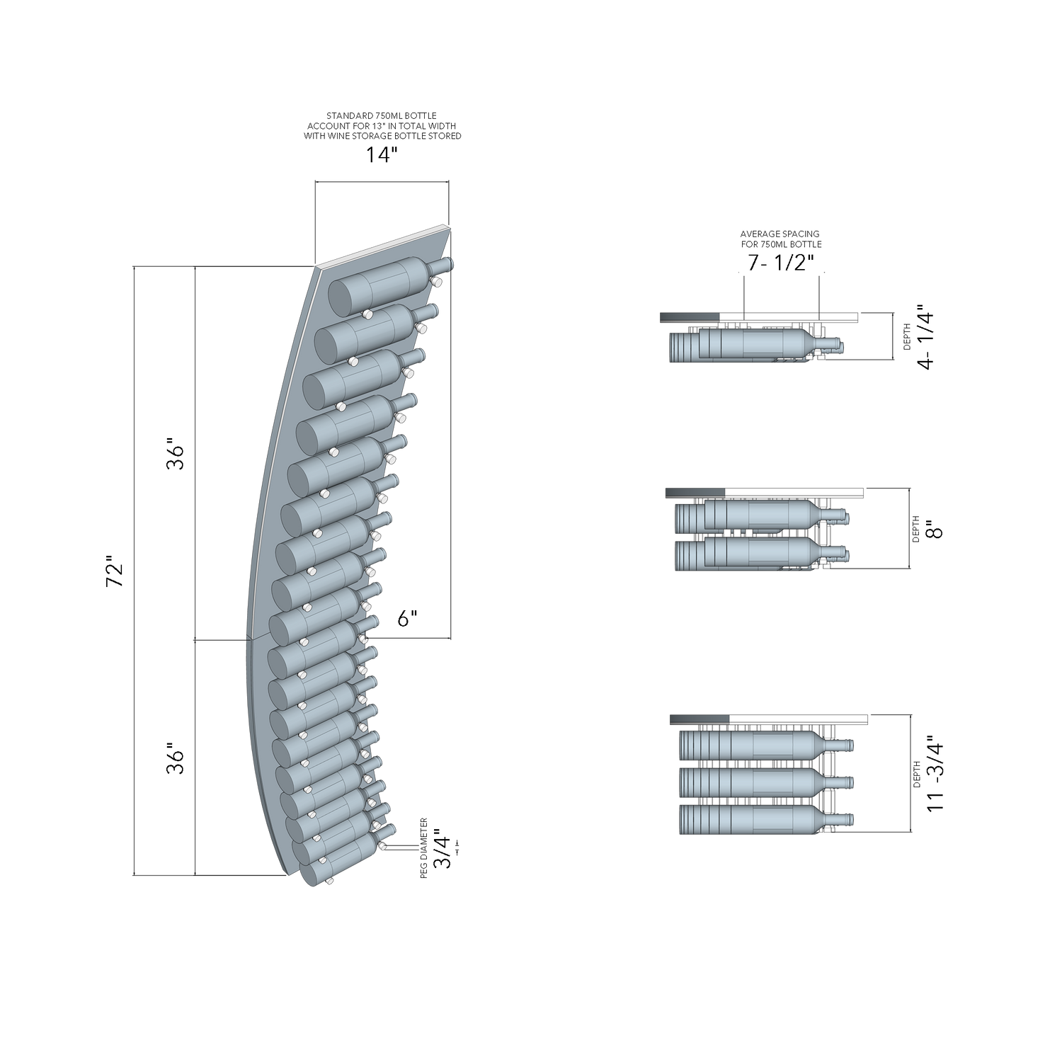 - Note: Maximum bottle diameter is 3 3/8" (86 mm). Magnums, Champagnes or oversized 750ml bottles will not fit vertically between pegs.