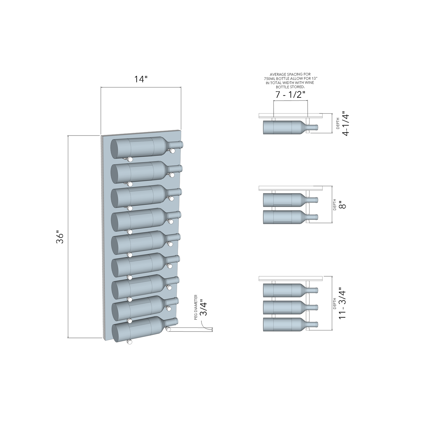 - Note: Maximum bottle diameter is 3 3/8" (86 mm). Magnums, Champagnes or oversized 750ml bottles will not fit vertically between pegs.
