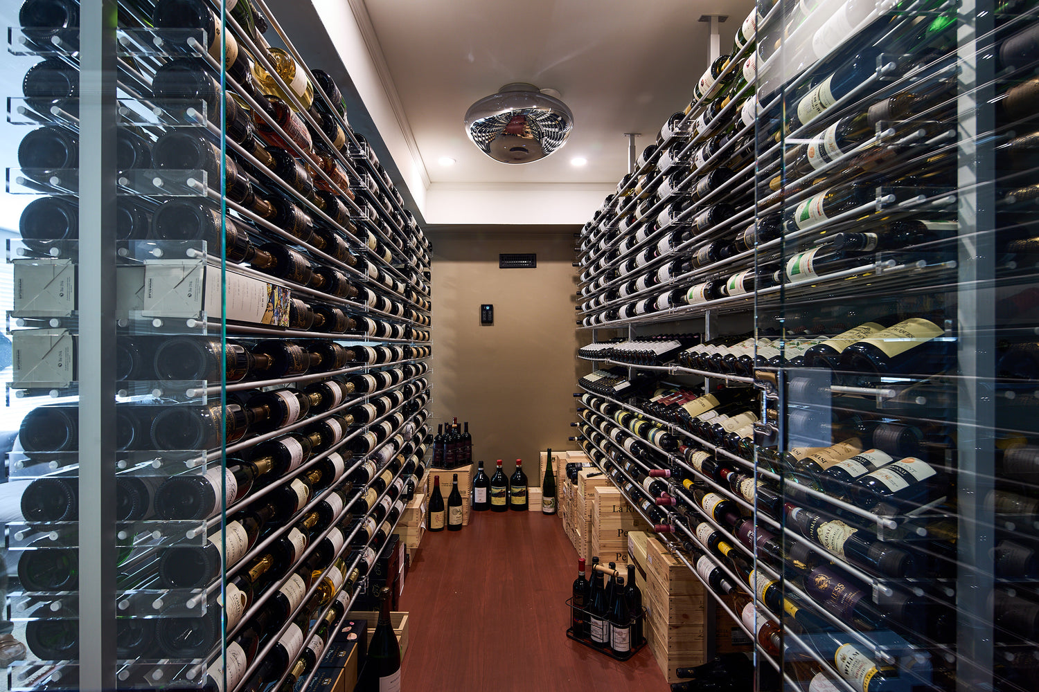 This large cellar combines standard, magnum, and double magnum wine racks to accommodate bottles of all sizes.