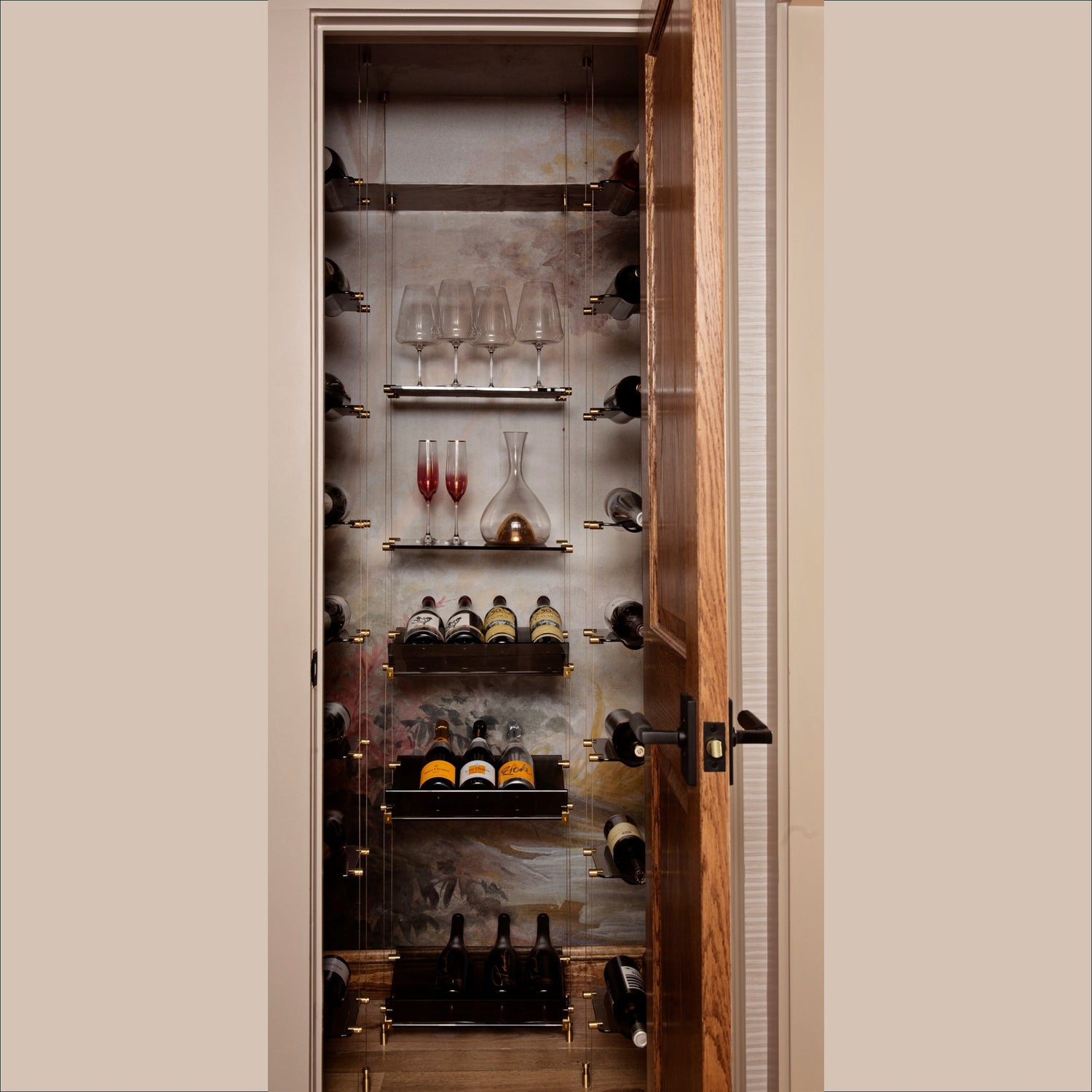 A beautifully designed compact wine closet featuring a sleek floating racking system. This setup maximizes storage efficiency while maintaining a clean, modern aesthetic. Perfect for showcasing wine collections in a stylish and space-saving way, combining functionality with elegant design.