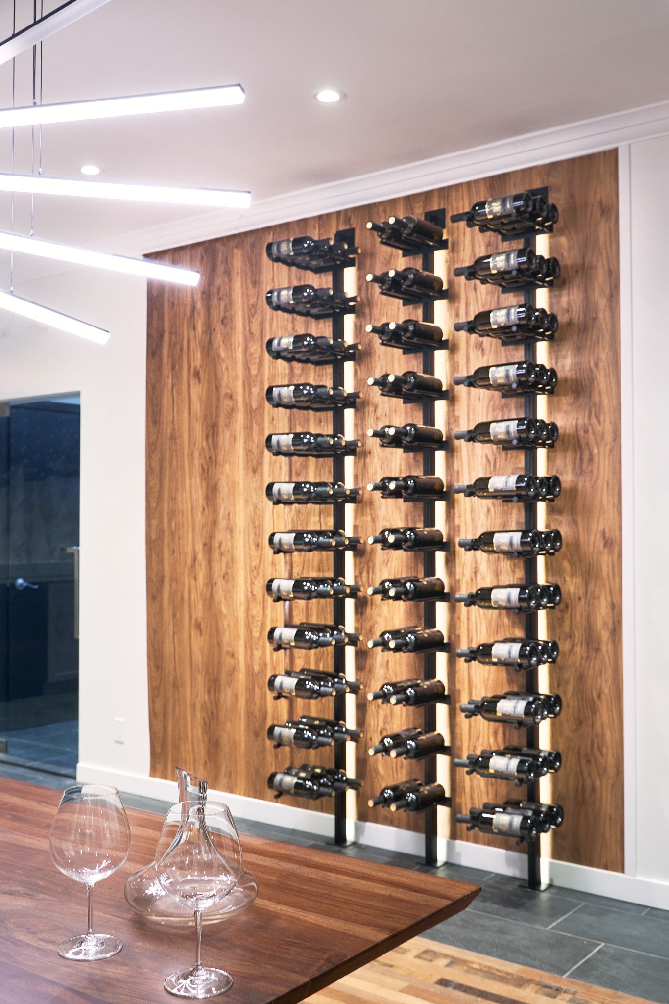 A sleek, LED‑lit Modual X wine showcase featuring horizontal metal racks and warm contemporary interior styling.