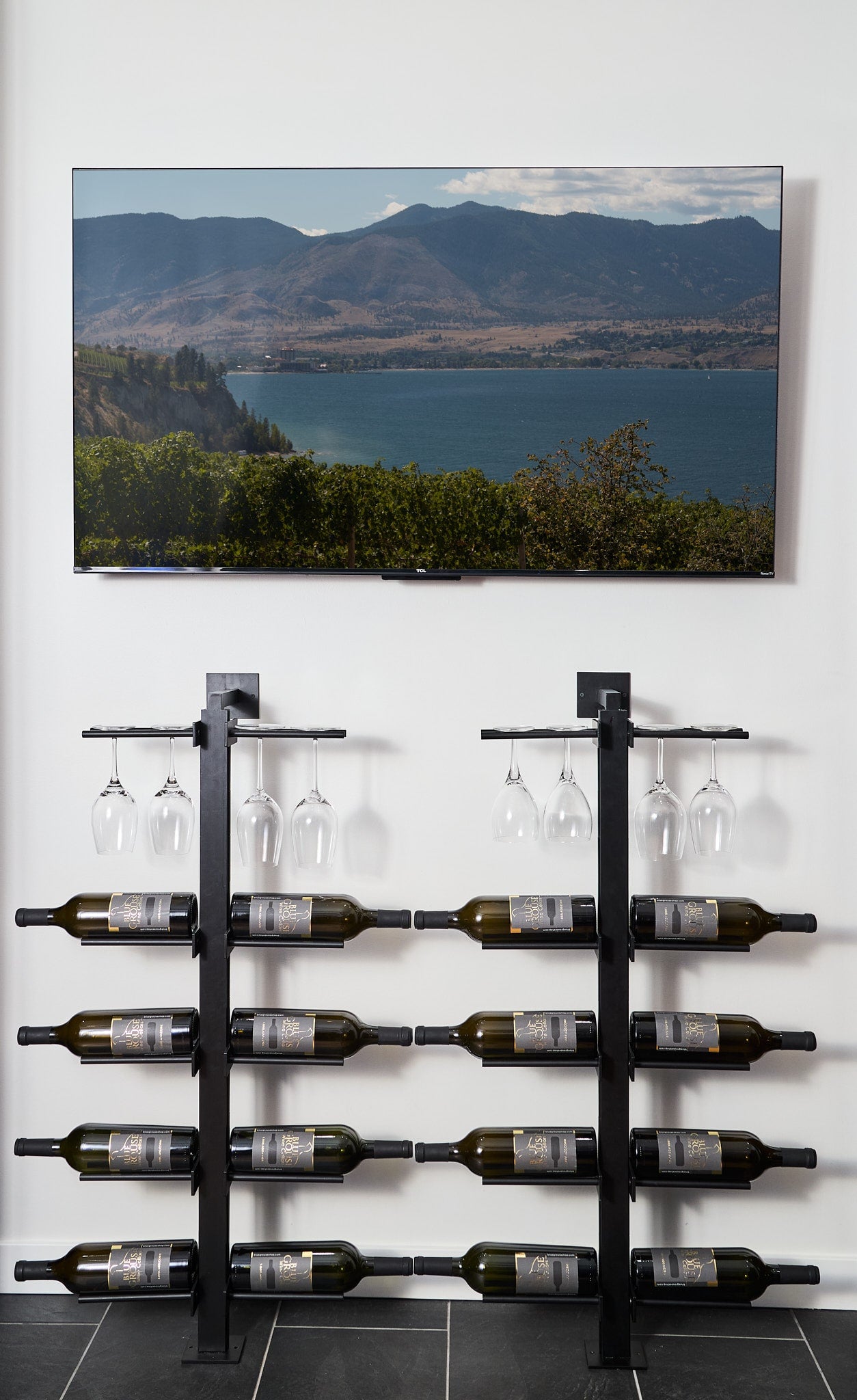This custom cellar incorporated both standard wall series Vintage View wine racks as well as those for Magnums and Champagne bottles. The matte black finish blends beautifully with the rustic wood wall paneling.