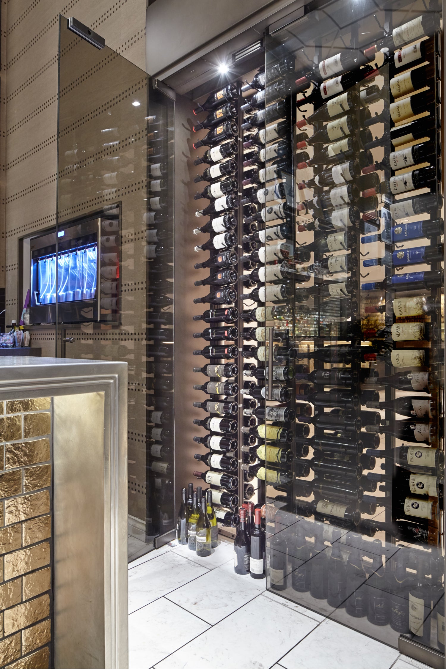 Three bottle deep Millesime wine racks mounted inside a restaurant glass wine cellar.