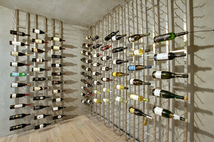 Brushed nickel VintageView wine racks suspended from floor to ceiling.
