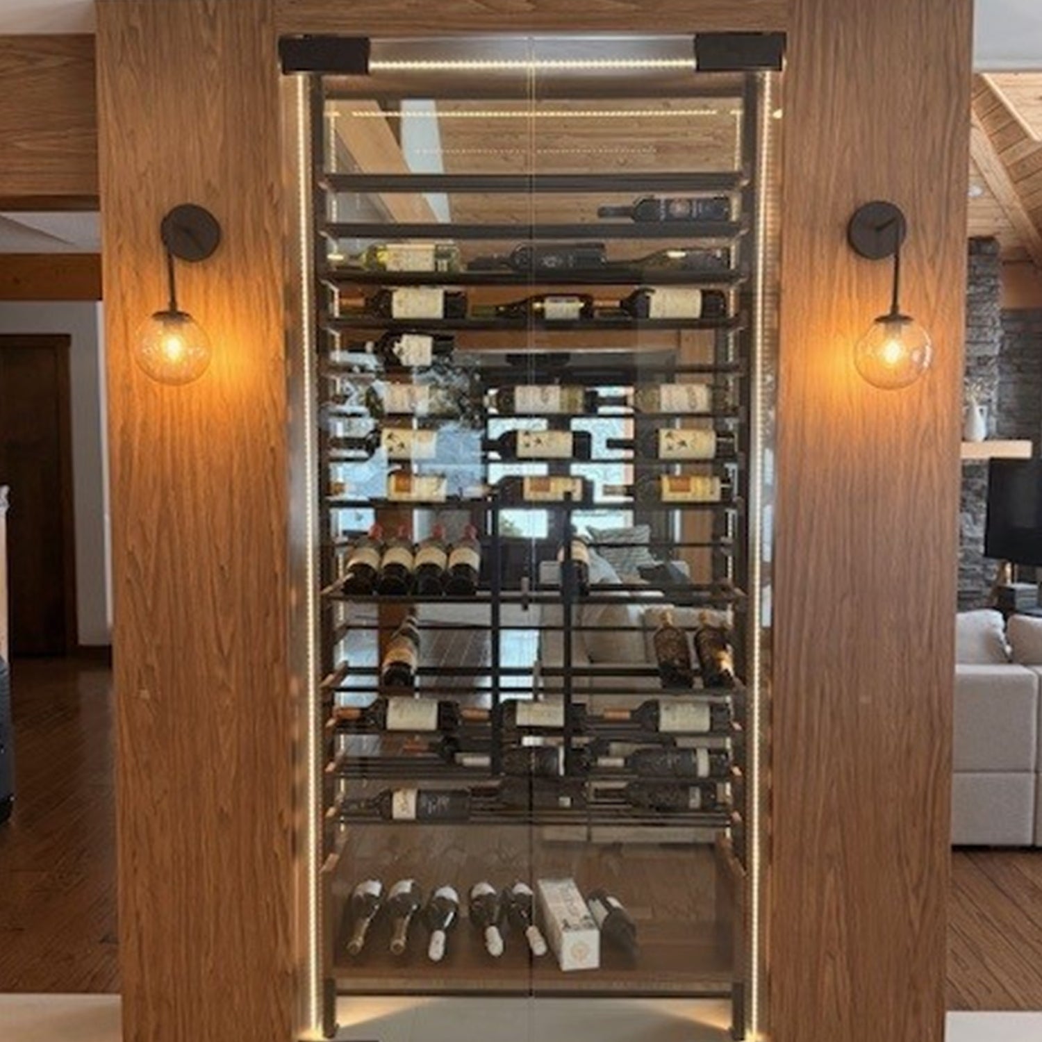 The Millesime wine cabinet combines warm wood accents, sleek metal racking, and glass‑front styling to create a refined, built‑in display. Its label‑forward layout and soft interior lighting showcase each bottle beautifully, adding a modern, luxurious touch to any home bar or wine room.