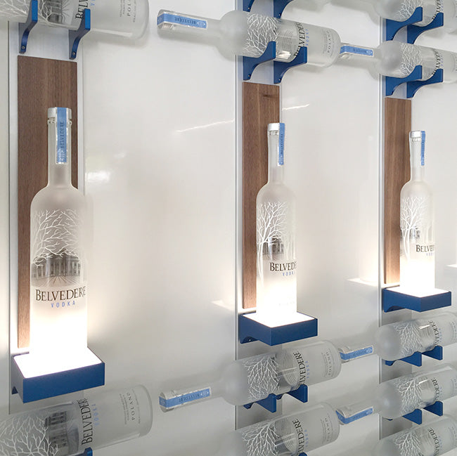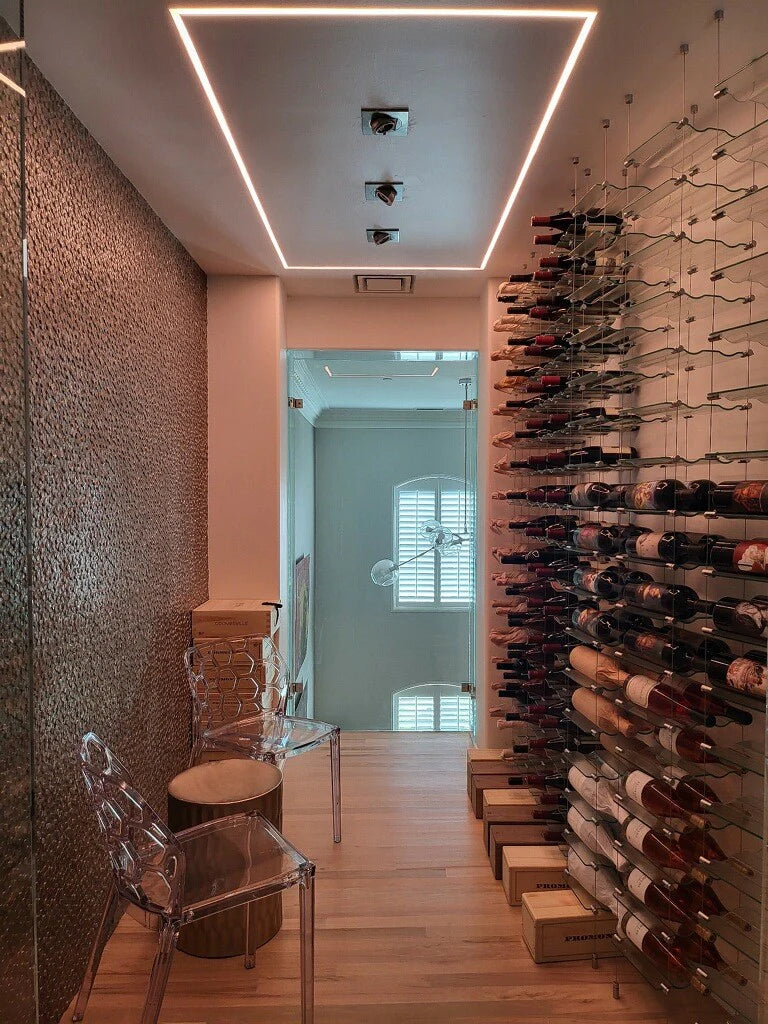 This Millesime Floating Bottles wine racking looks perfect in this glass-enclosed wall niche with LED accent lighting.
