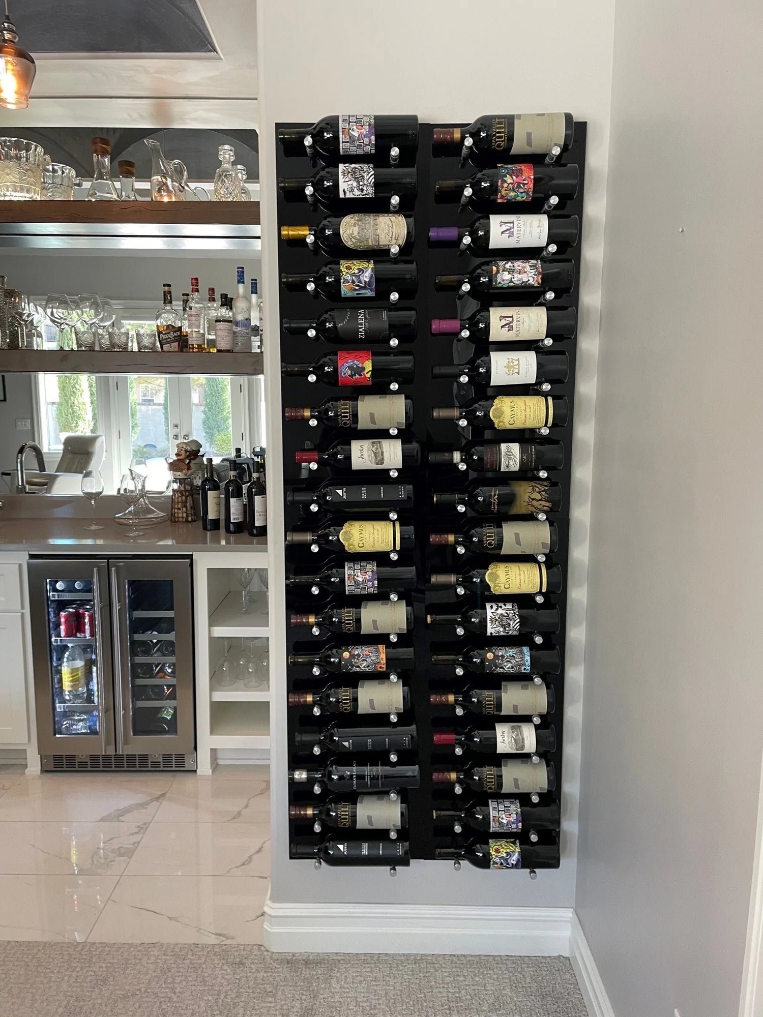 These homeowners can store and display up to 36 bottles of wine on their VINdustry wine peg and panel kits, installed directly to drywall in their home bar area.